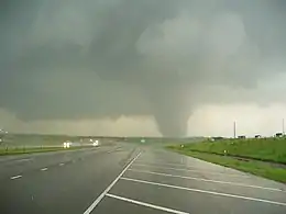 By the afternoon hours, rapid destabilization of the boundary layer began across eastern Kansas, prompting a tornado watch for the area.[31] Further south in Oklahoma, a rapidly mixing dry line accompanied by a deepening surface low moved eastward into an area with deep moisture. Though leftover outflow boundaries from the previous day's storms and capping limited initial convective activity, strong daytime heating would soon allow storms to break the cap.[32] A tornado watch was issued for the central third of Oklahoma at 2:15 p.m. CDT (1915 UTC), with the SPC noting the risk for potentially long-lived supercells and a few strong tornadoes.[33] Around 2:30 p.m. CDT (1930 UTC), a supercell developed over Harper County, Kansas and tracked northeastward. This cell produced three short-lived tornadoes, including an EF2 to the southwest of Wichita that prompted a tornado emergency for the city.[34][35] Over the course of three hours, 10 other tornadoes touched down across the state, none of which exceeded EF1 intensity.[5][34]