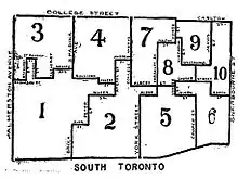 The riding was established in 1894. The boundaries were College Street and Carlton Street to the north, Sherbourne Street to the east and Palmerston Avenue to the west. It was bounded on the south by Lake Ontario.[1]