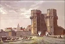 The Serrans Gate or Serranos Gate (Valencian: Porta dels Serrans, Valencian: [ˈpɔɾta ðels seˈrans]; Spanish: Puerta de Serranos, [ˈpweɾta ðe seˈranos]), also known as Serrans Towers or Serranos Towers (Valencian: Torres dels Serrans, Valencian: [ˈtorez ðels seˈrans]; Spanish: Torres de Serranos, [ˈtores ðe seˈranos]) is one of the twelve gates that formed part of the ancient city wall, the Christian Wall (Muralla cristiana), of the city of Valencia, Spain. It was built in Valencian Gothic style at the end of the 14th century (between 1392 and 1398). Its name is probably due to its location in the northeast of the old city centre, making it the entry point for the royal road (camí ral) connecting Valencia with the comarca or district of Els Serrans (along the road going northwest towards the mountains around Teruel and eventually leading to Saragossa) as well as the entry point for the royal road to Barcelona, or because the majority of settlers near there in the time of James I of Aragon were from the area around Teruel, whose inhabitants were often called serrans (mountain people) by the Valencians. Alternatively, the gate may also have been named after an important family, the Serrans, who lived in a street with the same name.