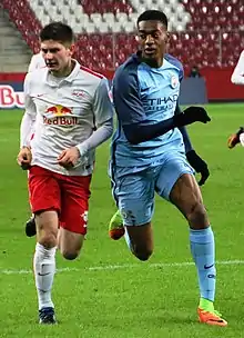 Ahead of the 2016–17 season, and following the appointment of Pep Guardiola as Pellegrini's replacement, Adarabioyo was linked a move away from City amid reports of interest from Celtic and Tottenham Hotspur.[14] He ultimately remained with the club and was praised by Guardiola for his performances during the pre-season, which resulted in him being definitively promoted to the first team.[15][16] He made his Champions League debut as a substitute for John Stones in a 1–0 play-off round win over Steaua București on 24 August 2016, before becoming the then-youngest player to start a match in the competition for the club later that year, at the age of 19 years and 73 days.[17][18] He also made his League Cup debut during the campaign in which he featured three times in total, earning a contract extension at the end of the season.[19][9]