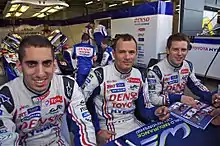 In early 2012, Toyota named seven drivers to the team. Sébastien Buemi, the third driver for the Red Bull Racing Formula One team, had no prior experience of endurance motor racing.[6] Former Williams Formula One and Formula Nippon driver Kazuki Nakajima also came from an open wheel racing background.[28] Anthony Davidson was added to the team for his previous experience with sports cars,[5] while Nicolas Lapierre transferred from Team Oreca's Le Mans squad.[5] Alexander Wurz also had extensive experience of sports car racing having twice won the 24 Hours of Le Mans.[5] Stéphane Sarrazin was employed by Toyota in May 2012 to replace Hiroaki Ishiura who withdrew following the completion of the car's first testing session due to back discomfort.[29] Super GT competitor Andrea Caldarelli served as the team's junior driver.[5]
