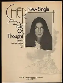 "Train Of Thought" is the second single released by an American singer/actress Cher from her 1974 album Dark Lady. It reached number #27 on the Billboard Hot 100 and #9 on the Adult Contemporary chart.[1] Allmusic retrospectively described this song as "raw and fast-moving rock."[2] In 1976, the song was covered by an American singer-songwriter and musician Gene Pitney.