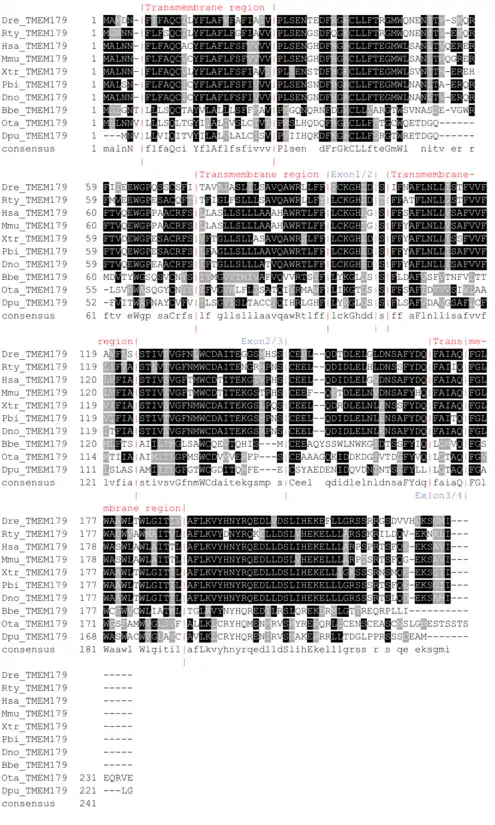 A multiple sequence alignment of orthologous transmembrane protein 179 sequences from various species. The sequences are named with the first letter of the organism's genus name followed by the first two letters of the species name (Homo sapiens is labelled Hsa_TMEM179). Amino acids that are shaded black are highly conserved. This multiple sequence alignment was made using Clustal Omega and Boxshade.[30][31]