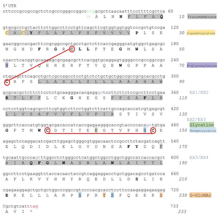 A cartoon of transmembrane protein 179 depicting the orientation and location of the post-translational modifications of the protein.[22] The gray flags indicate the location of predicted post-translational modifications.