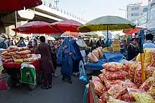 The Taliban promoted the use of the extended family, or zakat system of charity to ensure women should not need to work. However, years of conflict meant that nuclear families often struggled to support themselves let alone aid additional relatives.[2] Qualification for legislation often rested on men, such as food aid, which had to be collected by a male relative. The possibility that a woman may not possess any living male relatives was dismissed by Mullah Ghaus, the acting foreign minister, who said he was surprised at the degree of international attention and concern for such a small percentage of the Afghan population.[22] A Physicians for Human Rights researcher that travelled to Kabul in 1998 described "a city of beggars" filled with "women who had once been teachers and nurses now moving in the streets like ghosts under their enveloping burqas, selling every possession and begging so as to feed their children."[7]:3