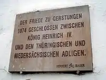 The Treaty of Gerstungen (German: Frieden von Gerstungen) was concluded on 2 February 1074 in Gerstungen Castle on the River Werra in what is now Germany. It required King Henry IV to restore Duke Otto of Northeim to the Duchy of Bavaria. In 1073 the latter had successfully headed the rebellion of the Saxons. King Henry had to escape from the siege of the Harzburg castle and, under the requirements of the treaty, to accede to the slighting of his castles in the Harz mountains, including for example, the Sachsenburg at Bad Sachsa and only built in 1070.