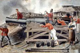 Paraguay had now made war on the much more populous Empire of Brazil, on Argentina (also more populous),[60] and threatened the Colorado faction of Uruguay, which by now had come into power. The three countries had been accustomed to thinking about Paraguay as a backward upstart and were outraged.[61] Their foreign ministers met in Buenos Aires and negotiated the Treaty of the Triple Alliance.