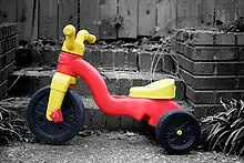 A tricycle is a typical toy for children between the ages of eighteen months and five years before a balance bike.[21] Compared to adult models, children's trikes are simpler, without brakes or gears, and often with crude front-drive. Child trikes can be unstable, particularly if the wheelbase or track are insufficient.[22] Some trikes have a push bar so adults can control the trike.[22] Child trikes have frames made of metal, plastic, or wood.