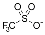In organic chemistry, triflate (systematic name: trifluoromethanesulfonate), is a functional group with the formula R−OSO2CF3 and structure R−O−S(=O)2−CF3. The triflate group is often represented by −OTf, as opposed to −Tf, which is the triflyl group, R−SO2CF3. For example, n-butyl triflate can be written as CH3CH2CH2CH2OTf.