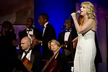 In late 2018 Yearwood announced the release of a new album consisting of songs previously recorded by Frank Sinatra. Titled Let's Be Frank, it was recorded live at the Capitol Records building and was backed by a full piece orchestra. Yearwood used Sinatra's original microphone during the recording process. It was released in December 2018, exclusively at Williams Sonoma stores, and worldwide on February 14, 2019.[58] The album peaked at number 2 on the Billboard Jazz Albums chart.[59] In his review, Kevin John Coyne of Country Universe praised the release, giving it four of five possible stars. In discussing the album, Coyne commented, "Let's Be Frank is a delightful detour, and while it doesn't curb the hunger for more country music from the greatest female artist of the greatest generation of female artists, it is chock full of reminders of how she earned that distinction in the first place."[60] Trisha Yearwood performed the Sinatra covers on March 7, 2020, with the Baton Rouge Symphony Orchestra, conducted by Timothy Muffitt. Yearwood was invited to perform with the BRSO as the 2020 selection of the "Pennington Great Performers" series.