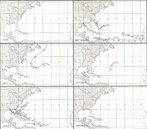 The season officially began on June 1,[2] and lasted until November 30, 1971; these dates conventionally delimit the period of each year when most tropical cyclones form in the Atlantic basin.[3] With thirteen tropical storms, of which six became hurricanes, the season was active. Despite the activity, damage in the United States totaled about $235 million (1971 USD, $1.7 billion 2024 USD), which National Hurricane Center forecaster Paul Hebert noted was "pretty small considering we had five storms in a row strike the U.S."[3] Most of the damage came from Tropical Storm Doria, which affected much of the East Coast of the United States. Hurricane Fern struck Texas after executing an unusual track, dropping heavy rainfall and producing flooding. The first storm, Arlene, developed on July 4 off the coast of North Carolina. Activity was steady through most of the season, and the last storm, Laura, dissipated on November 22.