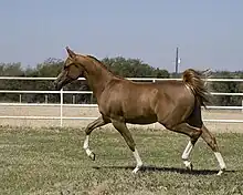 • Park trot: Sometimes simply called a Trot in a given class and seen in saddle seat and fine harness classes for Saddlebreds, Arabians and Morgans. It is a showy, flashy trot with extreme elevation of the knees (forearm is horizontal or higher and the hind legs are extremely flexed). The head is held high and at times a horse may hollow its back and lose cadence in an attempt to achieve high action in front. The hindquarters must be engaged for it to be properly performed.