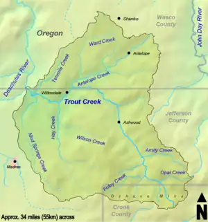 Trout Creek's headwaters are in the western Ochoco Mountains, northeast of Prineville. It flows north, gathering minor tributaries such as Auger Creek and Amity Creek. The creek turns northwest and then west near the ghost town of Ashwood, straddling the Jefferson/Wasco county line. It receives Antelope Creek on the right bank. Highway 97 crosses the creek near Willowdale. Several miles downstream, Trout Creek receives Hay and Mud Springs creeks on the left bank.[5] It then flows into the Deschutes River 87 miles (140 km) above its confluence with the Columbia River.[4]