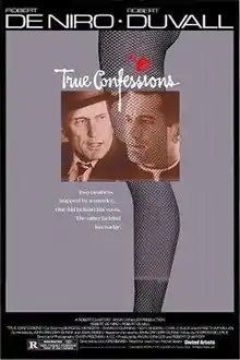 True Confessions is a 1981 American neo-noir[3] crime drama film directed by Ulu Grosbard and starring Robert De Niro and Robert Duvall as the brothers Spellacy, a priest and police detective. Produced by Chartoff-Winkler Productions, it is adapted from the novel of the same name by John Gregory Dunne, loosely based on the Black Dahlia murder case of 1947. Dunne wrote the screenplay with his wife, novelist Joan Didion. The film was released on September 25, 1981, receiving generally positive reviews from critics.