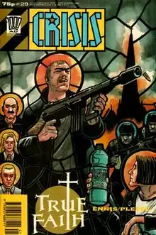 "True Faith" is a creator-owned British comic story. It was originally published in the adult-orientated anthology comic Crisis between 14 October 1989 and 17 February 1990. Written by Garth Ennis and drawn by Warren Pleece, the story is a satirical critique of organised religion.