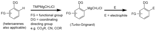 Neufeld et al. suggested that the highly regioselective ortho deprotonation reactions of TMPMgCl·LiCl could stem from a sufficient complex-induced proximity effect (CIPE) between the bimetallic aggregate and the functionalized (hetero)aromatic substrate.[10]