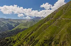 The park is set in the Tusheti Mountainous region in the north-eastern part of the country. It is 205 kilometres (127 mi) away from Tbilisi with the en route Alvani lying 120 kilometres (75 mi) away. Omalo-Alvani highway of 85 kilometres (53 mi) length is in a hilly terrain and is difficult to drive. The visitor center to the parks and reserves of Tusheti is located along the 85 kilometres (53 mi) of the main watershed ridge of Caucasus in lower Omalo.[7] Its ecoregion is that of the Caucasus mixed forests.[8]