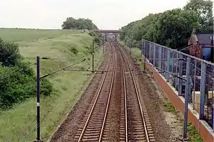 The tracks through the station site are now part of the electrified East Coast Main Line.