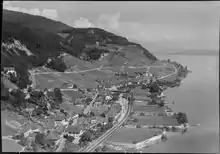 ![]() Twann village with Lake Biel/Bienne and St. Peter's Island in background | |
