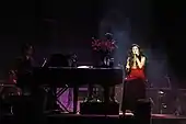 A wide shot photo of a concert stage with Velasquez performing wearing a red opera coat