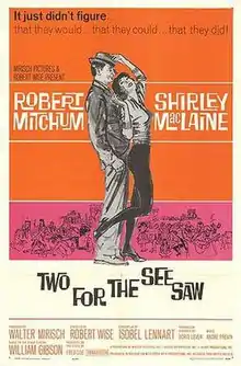 Two for the Seesaw is a 1962 American romantic-drama film directed by Robert Wise and starring Robert Mitchum and Shirley MacLaine. It was adapted from the 1958 Broadway play written by William Gibson with Henry Fonda and Anne Bancroft (who was awarded the 1958 Tony Award for Best Featured Actress in a Play) in the lead roles.[3]