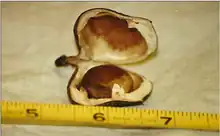 The nutritional value of the marama bean is astonishingly high for an unimproved legume. The tubers have a high protein content of 9.0% and also have a high amino acid content. The tubers of cassava, for comparison, only have a protein content of 1-3%, while yam has one of 7%. Also the grain is relatively high in protein with a share of 30-39%. The concentration of sulphur-containing amino acids is high as well (with a lysine content of 5.0% and a methionine content of 0.7%). This shows that the protein content of the seeds is comparable to the one of commercial soybeans, which have a content of 38-40%. Therefore, the potential of the marama bean is high to replace the soybean as a protein source, once there have been genetical improvements.[3] The seeds develop in typical legume pods, albeit large and squat in shape, typically one or two seeds per pod.