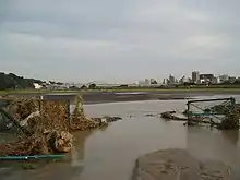 The water level of the Tama River exceeded dangerous level because of the heavy rain by Typhoon Fitow.[19] Rainfall rates peaked at 66 mm/h (2.5 in/h) in Miyagi Prefecture and the highest accumulation was 694 mm (27.3 in) in Tokyo.[20] Twenty-nine people were rescued from sandbanks on the Tama River on September 7 after the storm impacted Japan with powerful winds and heavy rain.[19] At least 80,000 people were left without power as high winds from Fitow knocked down power lines.[16] A 76-year-old man was killed[21] when a tree limb fell on him.[16] Several homes were reportedly destroyed by the typhoon.[21] Three people were killed and 87 others were injured by Fitow throughout Japan. Heavy rains triggered 527 landslides throughout the country. Fourteen structures were destroyed, 62 were damaged, and another 1,941 were affected. A total of 17,037 hectares of farmland was damaged or destroyed by Fitow. About 1,113 km of roads, 1 km of railway, 14 ports, seven bridges, and six dykes were damaged. A total of 229,916 families were left without power at the height of the storm of which 4,010 also lost water supply. Nineteen ships sank during the storm. Agricultural losses amounted to $137 million (2007 USD).[22] Total damages from the typhoon were estimated at $1 billion (2007 USD).[23]