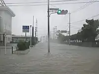 After the storm, members of Marine Corps Air Station Iwakuni provided $2,500 to the town of Iwakuni toward cleanup and disaster relief.[78] Soldiers also helped nearby residents and farmers to complete the rice harvest, after floods from the typhoon damaged harvesting machines.[79] The local government of Iwakunda distributed disinfectant chemicals to flooded houses.[80] Closed markets and decreased supplies caused the price of beef to reach record levels in the country.[81] Following the storm, the General Insurance Association of Japan reported that insurance claims from the typhoon totaled ¥58.8 billion (US$53 million), the tenth-highest for any natural disaster in the country. Miyazaki Prefecture reported the highest claims with ¥12.6 billion (US$11.4 million). The total was split between ¥49 billion (US$44 million) in housing claims and ¥7.9 billion (US$71 million) in car claims.[82] The Japanese government provided food, water, and rescue workers to the affected areas in the days after the storm, along with Japan Post, the local post system; trucks were mobilized to affected towns, accompanied by a mobile bank and insurance agent.[83]