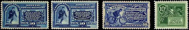 Five distinct issues showing the running messenger were made. Beginning in 1902 and continuing for 20 years, Special Delivery messengers were issued bicycles to deliver the mail and correspondingly a stamp was issued that year which depicted a messenger riding a bicycle and delivering the mail.[3]