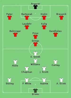 Germany dominated England and took a 2-0 after 21 minutes when Birgit Prinz and then Melanie Behringer scored.[19]