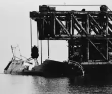 After the storm of December 8 and 9, 1989, salvors concluded that she could not be patched, pumped out, and refloated. The wreck would have to be lifted off the shoal and carried to her sinking site. To achieve this lift, a barge was chartered and a pair of lowering trusses originally used by Shell Oil for platform construction at its COGNAC oil field in the Gulf of Mexico were mounted on it. The heavy-lift barge was towed from Port Newark, New Jersey to Lake Superior during May 1990.[44]