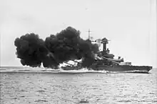 Over the following days, California remained off the invasion beach, pounding Japanese positions as American forces pushed their way inland. During this period, the Japanese fleet began moving into position for their counterattack. Allied reconnaissance aircraft and submarines reported sightings of the fleet as it approached the area, prompting the bombardment group to withdraw to southern Leyte every night in anticipation of a Japanese attack on the amphibious assault ships. On 24 October, reports of Japanese naval forces approaching the area led Oldendorf's ships to prepare for action at the exit of the Surigao Strait. Vice Admiral Shōji Nishimura's Southern Force steamed through the Surigao Strait to attack the invasion fleet in Leyte Gulf; his force comprised Battleship Division 2—the battleships Yamashiro and Fusō, the heavy cruiser Mogami, and four destroyers—and Vice Admiral Kiyohide Shima's Second Striking Force—the heavy cruisers Nachi and Ashigara, the light cruiser Abukuma, and four more destroyers.[16] As Nishimura's flotilla passed through the strait on the night of 24 October, they came under attack from American PT boats, followed by destroyers, initiating the Battle of Surigao Strait. One of these destroyers torpedoed Fusō and disabled her, though Nishimura continued on toward his objective.[17]
