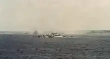 On the morning of 7 December 1941, California was moored on the southeastern side of Ford Island, the southernmost ship along Battleship Row. At the time, the ship had two of her 5-inch guns and two of her .50-cal. machine guns designated as ready guns, with fifty 5-inch shells and four hundred .50-cal. rounds at the guns. Immediately after the Japanese attack on Pearl Harbor began, California's first lieutenant, Lieutenant Commander Marion Little, who was the senior officer aboard the ship at the time, issued the order to general quarters. Little ordered the guns into action and prepared to get the ship underway. At 08:03, the crews of the ready guns began to engage the Japanese aircraft, which included Mitsubishi A6M Zero fighters that strafed the ship. The gunners quickly expended the ready ammunition, however, and the magazines had to be unlocked before they could be resupplied. While this effort was going on, a pair of Nakajima B5N torpedo bombers approached and dropped their torpedoes toward California. Both hit the ship at 08:05, one forward and the other further aft. The former detonated below the armor belt at frame 52 (between number 2 turret and the bridge), creating a hole 10 feet (3 m) high and 24 feet (7.3 m) long, destructively deforming the first torpedo bulkhead and transverse stiffeners between frames 47 and 60, and holing the second bulkhead with fragments. The latter tore a hole that was 40 feet (12 m) long below the belt armor.[5][7] The interior torpedo bulkheads nevertheless held and helped to contain the flooding.[8]