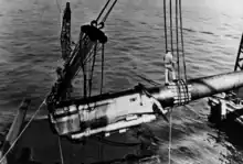 One of California's guns being raised from the ship to lighten her before being raised, c. February 1942