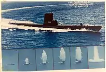 Montage of the end of Carbonero; sunk as a target by USS Pogy firing a Mk 48 torpedo off Pearl Harbor on 27 April 1975