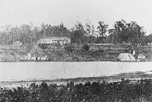 ![]() Moored to the river bank above the falls at Alexandria, Louisiana, during the Red River campaign, circa May 1864. USS Dahlia is at left, and USS Neosho is at right. | |