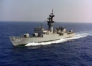 The Knox-class ships were armed with a 5"/54 caliber Mark 42 gun forward and a single 3-inch/50-caliber gun aft. They mounted an eight-round ASROC launcher between the 5-inch (127 mm) gun and the bridge. Close-range anti-submarine defense was provided by two twin 12.75-inch (324 mm) Mk 32 torpedo tubes. The ships were equipped with a torpedo-carrying DASH drone helicopter; its telescoping hangar and landing pad were positioned amidships aft of the mack. Beginning in the 1970s, the DASH was replaced by a SH-2 Seasprite LAMPS I helicopter and the hangar and landing deck were accordingly enlarged. Most ships also had the 3-inch (76 mm) gun replaced by an eight-cell BPDMS missile launcher in the early 1970s.[3]