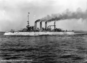 From September 1918 to the end of the conflict, Georgia was assigned to the Cruiser Force Atlantic as a convoy escort.[3] The ship's first operation was with troop ship convoy 67, which departed New York on 23 September; the rest of the escort consisted of the armored cruisers North Carolina and Montana and the destroyer Rathburne. Georgia had to take on 525 long tons (533 t) of coal in addition to her normal stocks, which significantly degraded her seakeeping characteristics. The ship accordingly had to be battened down to reduce flooding from heavy seas, which had the effect of hastening the spread of disease. During the cruise, the crew suffered from 120 cases of influenza and 14 cases of pneumonia; 7 men died from disease. Even with the additional coal, the ship did not have sufficient fuel to reach the hand off point and she had to break off from the convoy to return to port.[10] Germany signed an Armistice with the Allied powers, ending the war on 11 November. On 10 December, the ship was equipped to serve as a transport to carry American soldiers back from France. This duty saw the ship transferred to the Cruiser and Transport Force. She made five trips between December 1918 and June 1919, carrying almost 6,000 soldiers in total.[3] The first trip, made in company with the battleship Kansas, arrived in Brest, France on 22 December 1918.[11]