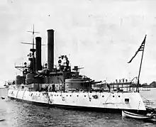 Six 4 in (100 mm)/40 cal quick-firing guns rounded out the secondary battery; these were intended to use their high rate of fire, coupled with high-explosive shells to damage unarmored parts of enemy warships. Four of these were placed in individual casemates in the forecastle deck, two in sponsons in the bow and the other two located amidships. The remaining two guns were in open shielded mounts on the aft superstructure, superfiring over the rear main battery turret.[8] They fired a 33 lb (15 kg) high-explosive shell at a muzzle velocity of 2,000 ft/s (610 m/s).[11] For defense against torpedo boats, the ship carried a battery of twenty 57 mm (2.2 in) 6-pounder Hotchkiss guns and four 37 mm (1.5 in) 1-pounder guns These guns were dispersed around the ship in a variety of individual mounts, including in the fighting top of the military mast, the superstructure, and in sponsons in the hull. She also carried four M1895 Colt–Browning machine guns chambered in 6mm Lee Navy.[7]