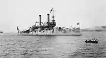 Iowa left Cuban waters after Spain surrendered in August, arriving in New York on 20 August. Captain Silas Terry took command of the ship on 24 September and on 12 October, she departed for the West Coast of the United States, where she was to join the Pacific Squadron. The next year passed uneventfully and Iowa put into the Puget Sound Navy Yard for an overhaul that began on 11 June 1899. She took part in training exercises off San Diego, California from 20 December to 15 January 1900. On the first day of the exercises, Iowa lost one of her Howell torpedoes after the practice warhead likely detached after it was launched. In March 2012, a pair of dolphins that were part of the Navy's Marine Mammal Program recovered the torpedo, which was missing the practice warhead;[12] the section recovered was later transferred to the Underwater Archaeology Branch for preservation. The torpedo is one of three Howell torpedoes known to exist.[13] During the period in San Diego, she received a pair of 3-inch field guns and four M1895 Colt-Brownings that were chambered in .30-40 Krag for use by landing parties ashore. After the training exercises, Iowa underwent a refit, after which she resumed her peacetime routine of training exercises, shooting practice, and cruises in the eastern Pacific. Captain Philip H. Cooper took command of the ship on 9 June, serving as her commander until 1 April 1901.[12] On 8 September, the sailing ship Mary Flint collided with her while she was at anchor in San Francisco Bay and then collided with a barque and sank.[14]