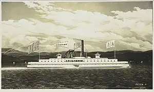 John P. Jackson was built at Brooklyn, New York, in 1860,[1] for use by the New Jersey Rail Road and Transportation Company as a ferry.[2] Construction occurred at the Devine Burtis yard, with the machinery built by Fulton Iron Works. Launched on 2 August 1860,[3] and completed in October, she measured 777 gross tons[2] and 750 tons burthen.[3] A sidewheel steamer, the vessel was 192 feet (59 m) long, with a beam of 36 feet 6 inches (11.13 m) and a depth of hold of 12 feet (3.7 m).[4] Power was provided by a 44 inches (110 cm) by 132 inches (340 cm) vertical beam engine.[2] The vessel had a top speed of 8 knots (15 km/h; 9.2 mph).[3] John P. Jackson ferried president-elect Abraham Lincoln across the Hudson River in February 1861, while he was journeying to Washington, D.C. to be inagurated.[5] On 6 November, John P. Jackson was purchased for service in the Union Navy during the American Civil War,[3] at a cost of $60,000.[6] The New Jersey Rail Road and Transportation Company had been directly requested by the United States government to sell the ship, and while the company's leadership regretted the sale of the vessel, wanted to comply with the government's request.[2] John P. Jackson was commissioned into military service on 14 February 1862, under the command of Lieutenant Selim Woodworth.[4] She was armed with four 32-pounder guns, a 9-inch (23 cm) Dahlgren gun, and a 6-inch (15 cm) Sawyer rifle. In July 1864, the Sawyer rifle was replaced by a 100-pounder Parrott rifle.[6] She carried a nominal crew of 99 in military service.[3]