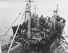 Johnston engaged the entire squadron, opening fire on Yahagi at 0850 from 10,000 yards and closed to 7,000 yards (6,400 m). She hit the cruiser 12 times and was in turn struck by several 5 in shells.[50] Yahagi, which was also being strafed by US aircraft, turned to starboard and disengaged. Johnston turned her fire on the Japanese destroyers, which soon also banked starboard and, with Yahagi, discharged their torpedoes at the carriers without effect.[51][52] The squadron, joined by two more cruisers, then focused on Johnston, and, in short order, denuded her of her main mast, last engine, and guns, rendered the bridge uninhabitable, and set much of the ship ablaze.[53] Evans moved his command to the fantail, where,[54] at 0945, he ordered the crew to abandon ship.[55][56] At 1010, Johnston rolled over and sank. Of her complement of 327 men, 186 men and officers, including Evans, died.[53] The remaining 141 men were rescued by American vessels after 50 hours at sea. Johnston was struck from the Navy Register on 27 November 1944.[11]