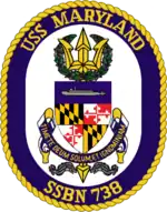 Maryland's coat of arms is emblazoned upon a white oval enclosed by a blue collar edged on the outside with gold rope and is inscribed in gold letters with the words "USS Maryland" above, and "SSBN-738" below.