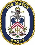 The coat of arms in full color as in the blazon, upon a white background enclosed within a dark blue oval border edged on the outside with a gold rope and bearing the inscription "USS Mason" at the top and "DDG 87" in the base all gold.