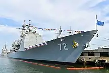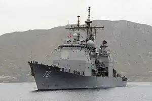 USS Vella Gulf (CG-72) is a Ticonderoga-class guided missile cruiser that served with the United States Navy. She was the second ship named for the Battle of Vella Gulf, a naval engagement in the Solomons campaign of World War II, the first being USS Vella Gulf (CVE-111), an escort carrier commissioned in 1945. The ship's keel was laid down on 22 April 1991 at Pascagoula, Mississippi, by Ingalls Shipbuilding, then a division of Litton Industries. She was launched on 13 June 1992, sponsored by Mary A. McCauley, wife of Vice Admiral William F. McCauley (Ret.), and commissioned on 18 September 1993 at Naval Station Norfolk.[3]