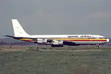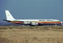 Uganda Airlines was founded as a subsidiary of the government-owned Uganda Development Corporation (UDC) in May 1976 as a replacement of the services previously operated by East African Airways.[4] It commenced operations in 1977, when Uganda Aviation Services (UAS), set up by British United Airways in 1965 but then a UDC subsidiary, was absorbed by Uganda Airlines, taking over the UAS route network.[4][5][6] Following delivery of the first Boeing 707-320C in the late 1970s, new routes to Brussels, London and Rome were inaugurated. A second Boeing 707-320C entered the fleet in 1981. That year, new routes to Cairo, Cologne and Dubai were launched, followed by Dar es Salaam, Kilimanjaro and Nairobi in subsequent years.[7]