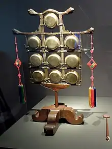 The ulla (hangul: 운라; hanja: or ) is a traditional Korean percussion instrument comprising a set of ten small tuned gongs in a wooden frame.[1] The gongs are struck with a beater.