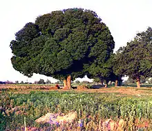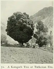 ... In a garden near our sarai we saw some very fine karagach. The karagach or Turkestan elm is one of the typical trees of the Duab landscape, chiefly owing to its tendency of forming leafy balloons of great regularity. As the main limbs shoot upwards like a bunch of flowers gradually unfolding near the top, and as the secondary boughs follow this example, the inner space of the cupola of foliage is a tangle of close-set ramifications which retains dead branches as well as the flotsam and jetsam of the air. As moreover short spikes and twigs grow out everywhere, the whole forms a disorderly nest of bark, leaves, sticks, and straws affording protection to many small birds.