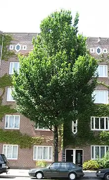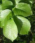 The tree has a broader crown than its siblings', whilst the generally obovate leaves, < 11 cm long by 7 cm wide, are less acuminate at the apex.[1][2] Like 'Lobel', the tree flushes markedly later than most other elms, and is rarely in full leaf before mid-May.