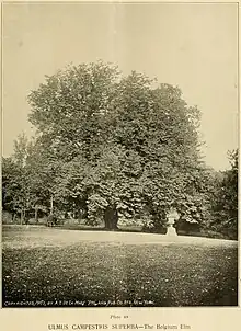 A large-leaved elm described as Ulmus campestris 'Superba' obtained from Louis van Houtte of Ghent, Belgium, before 1841 was photographed at the Ellwanger and Barry nursery at Mount Hope, Rochester, New York, c. 1900.[28] The photograph is also captioned 'Belgium Elm', possibly a reference to its source rather than a confusion with the hybrid 'Belgica'.[28] As the nursery later stocked the wych 'Superba', Blandford Elm, it is probable that propagation was from this tree.[20] Arnold Arboretum identified it in 1915 as a varietal form of Ulmus glabra Huds., which would match Blandford Elm, despite the apparent discrepancy in dates.[29]